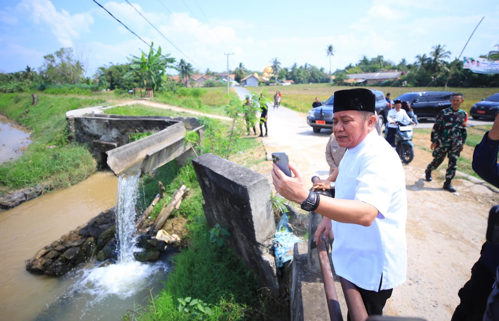 “Ini irigasi kecilnya putus. Kalau tidak segera diperbaiki, petani kita bisa merugi besar. Air tidak bisa mengalir ke sawah,” ujar Herman Deru sambil menunjukkan titik kerusakan.